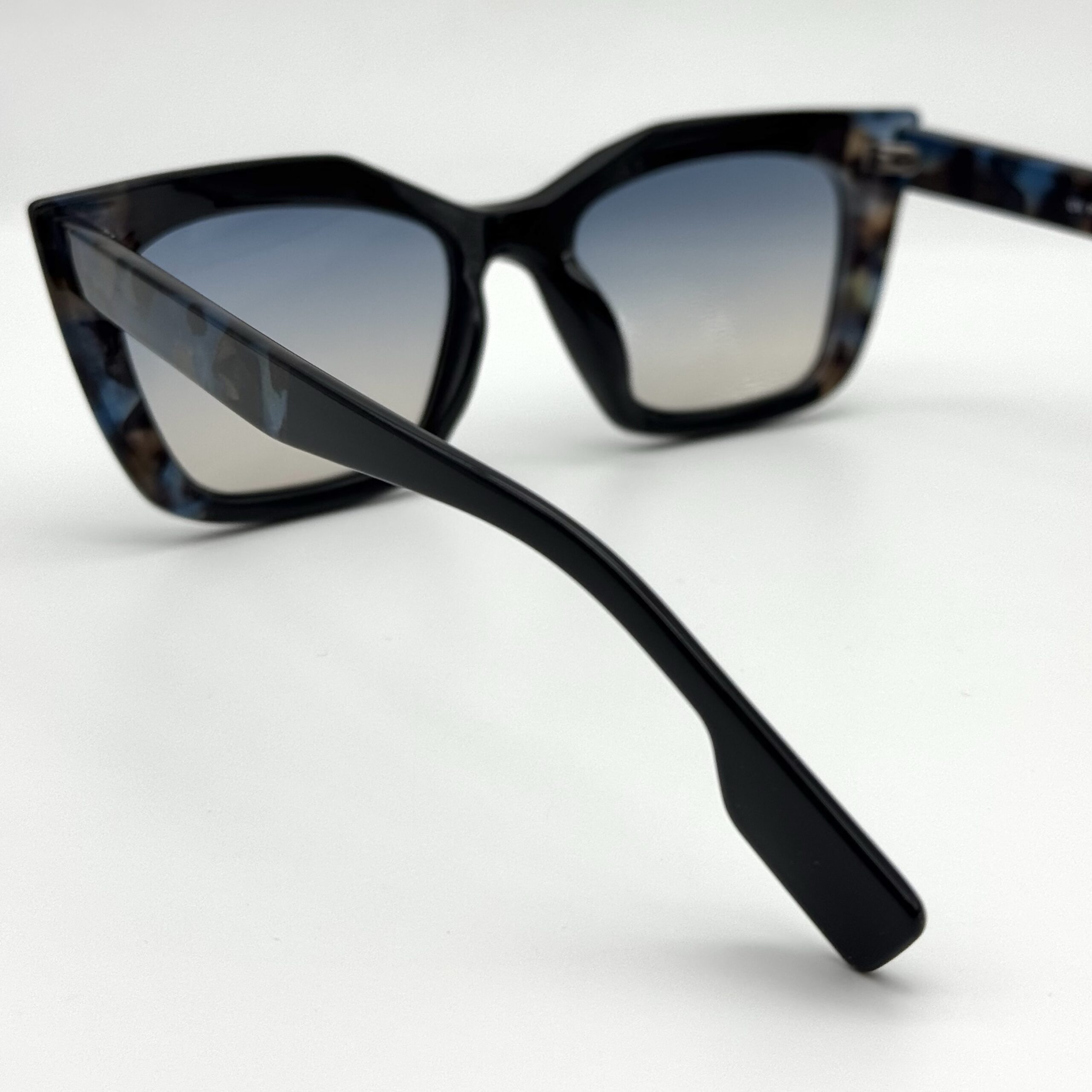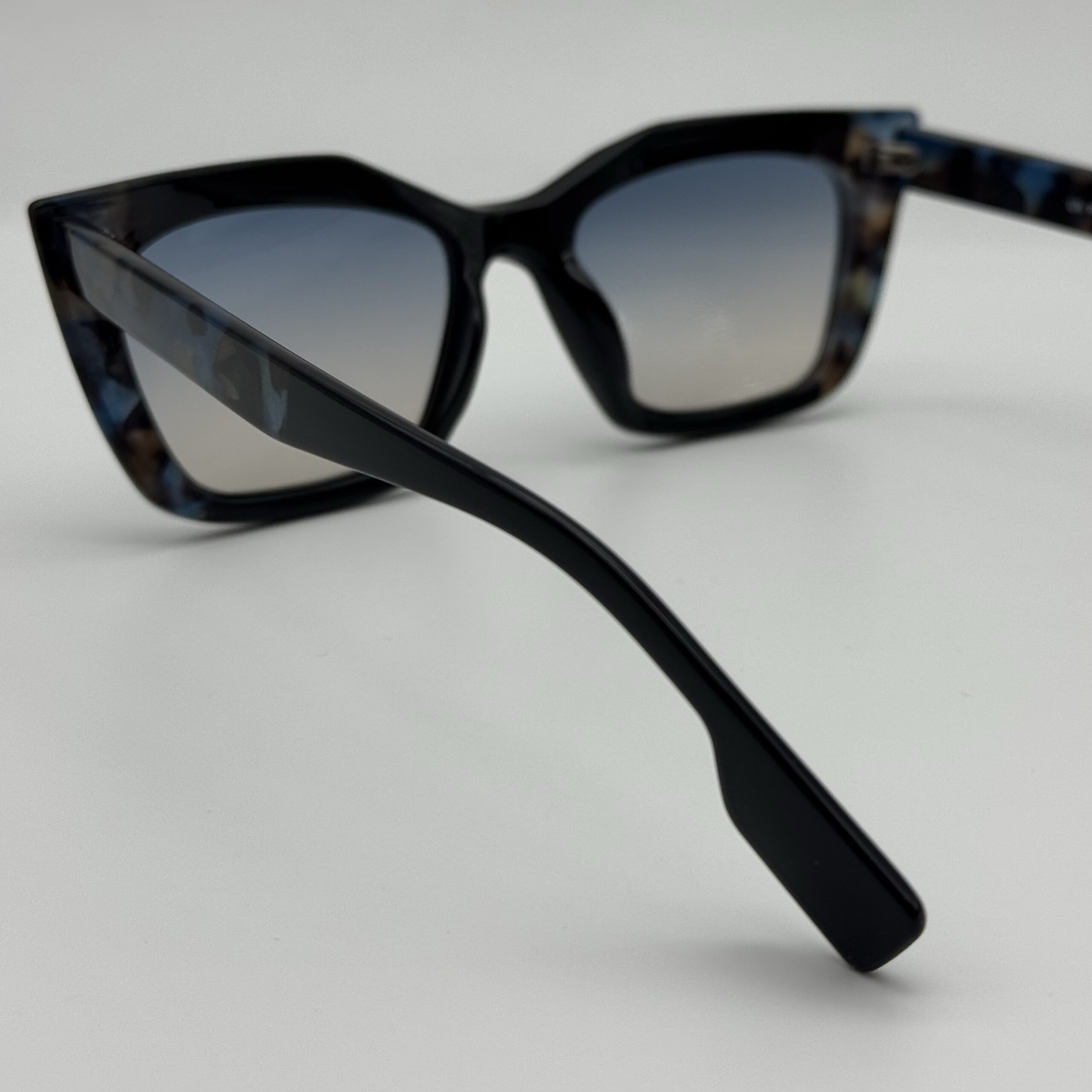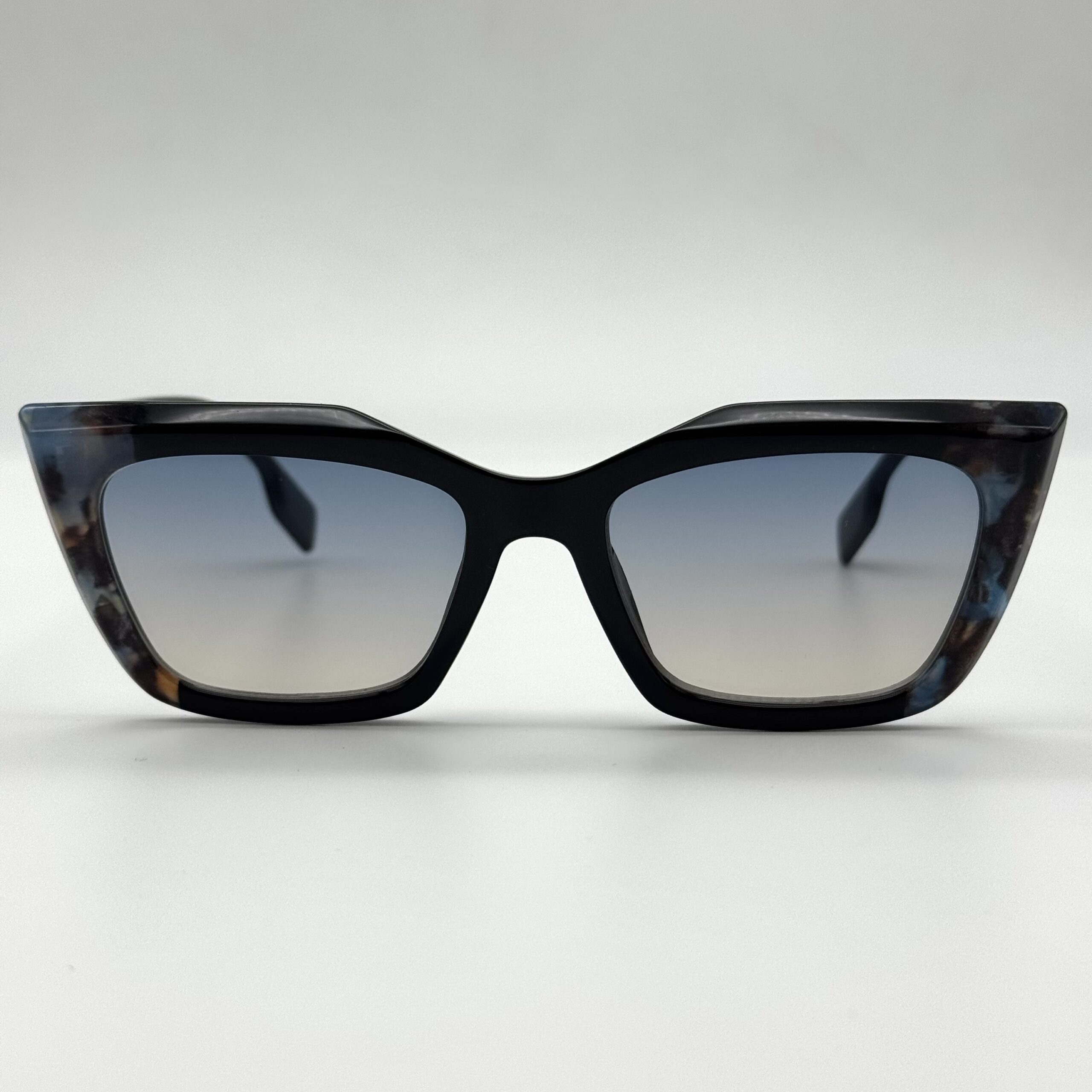 Une monture papillon mêlant noir et écaille bleutée pour un style original. Verres dégradés élégants pour un look chic et moderne.