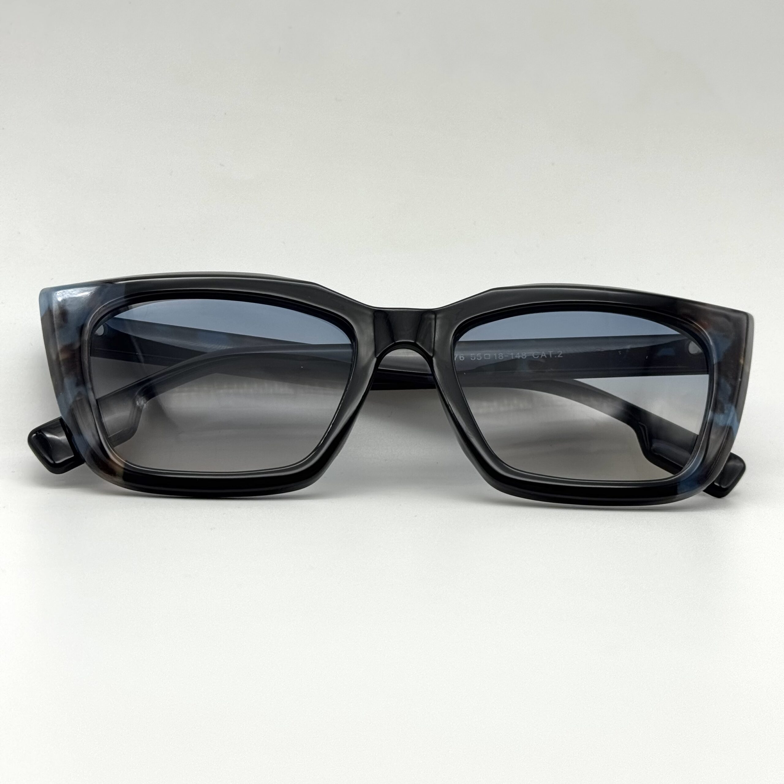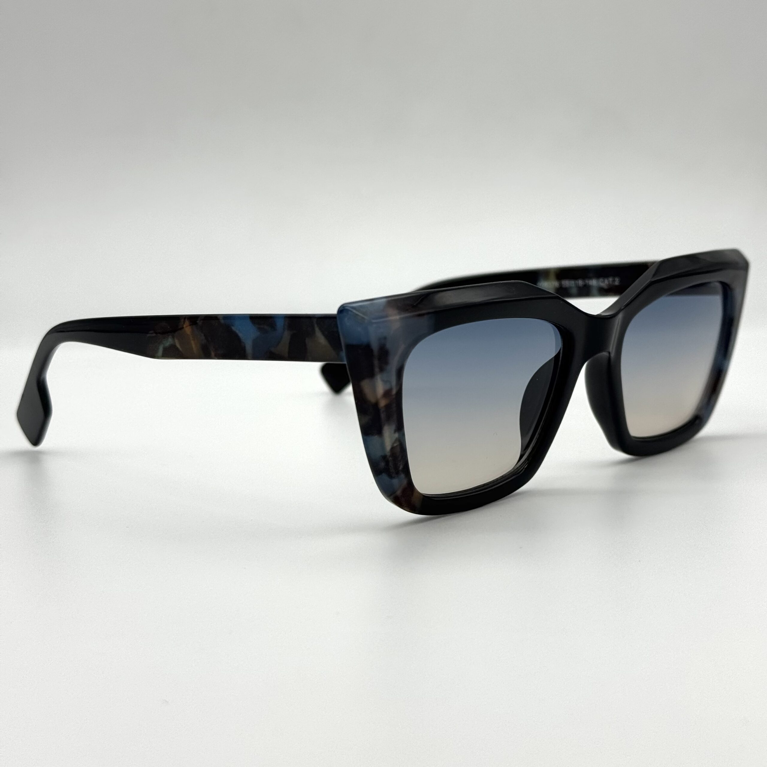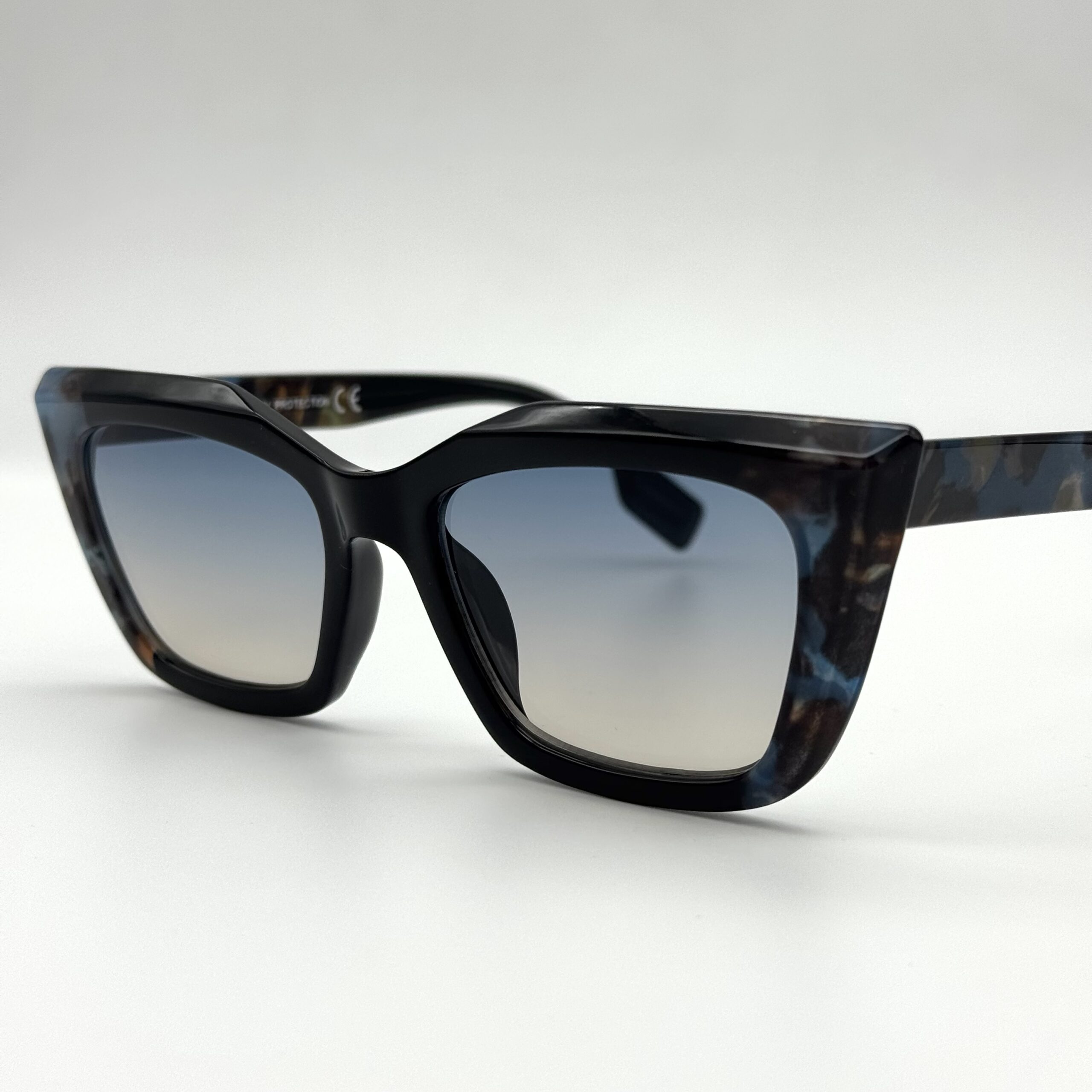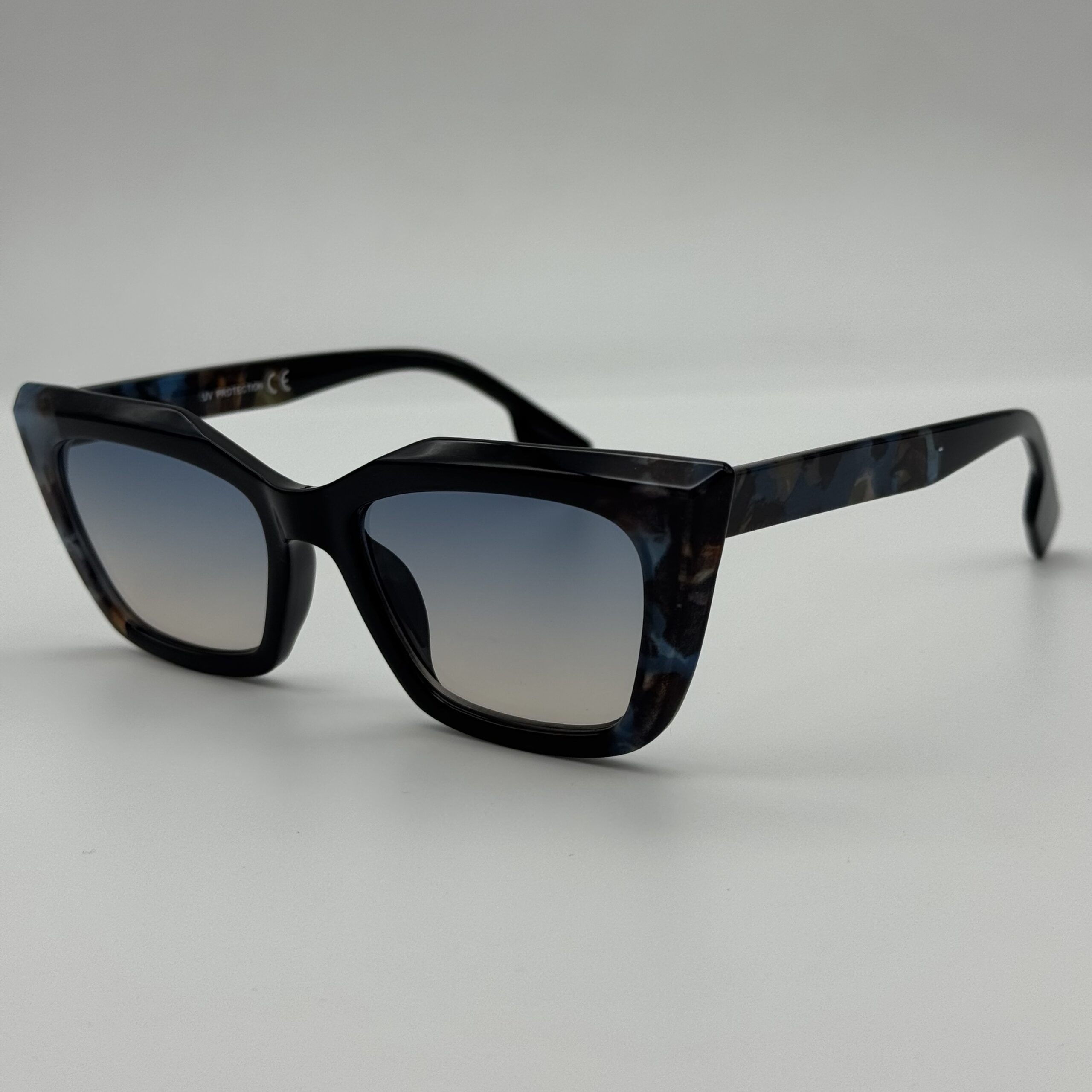 Une monture papillon mêlant noir et écaille bleutée pour un style original. Verres dégradés élégants pour un look chic et moderne.