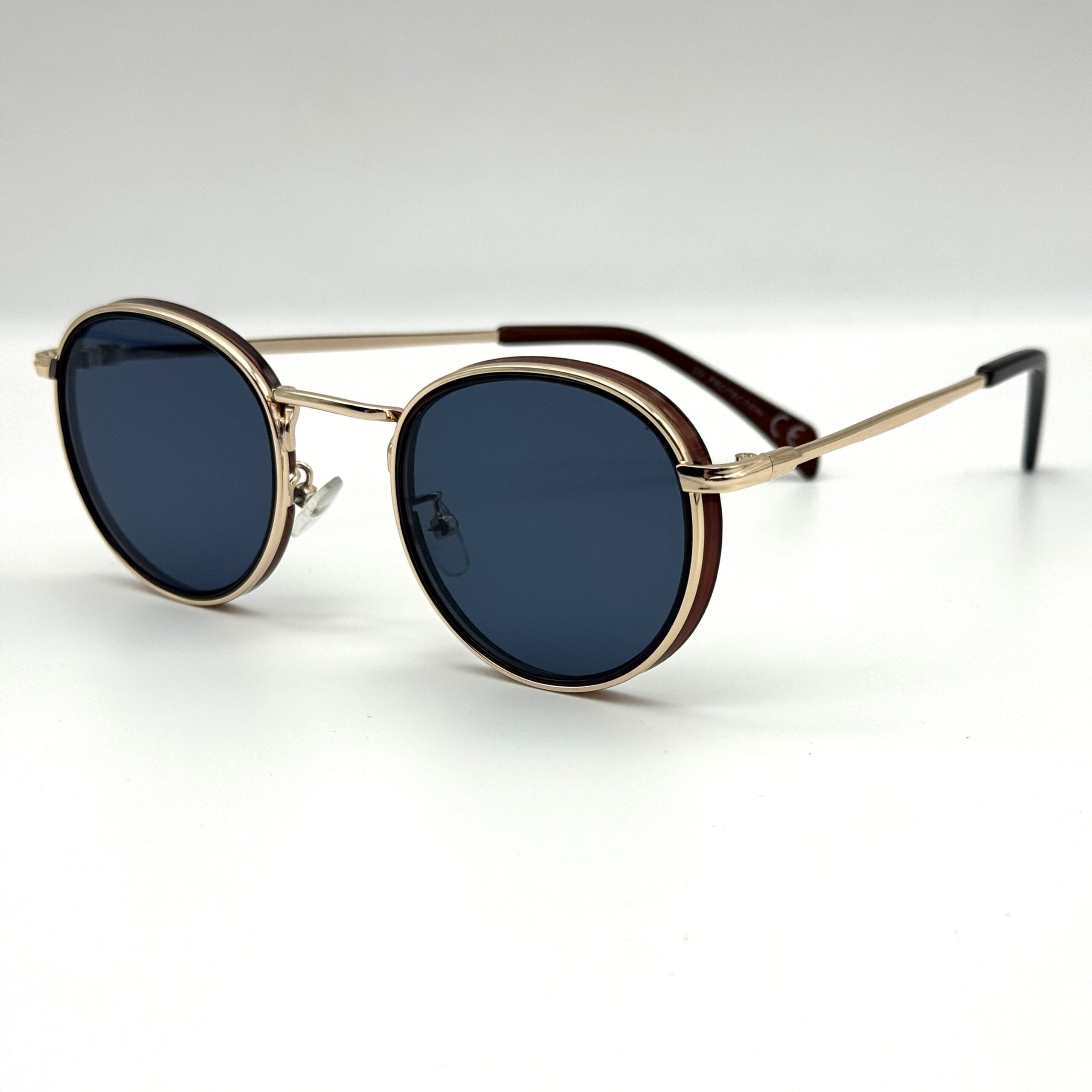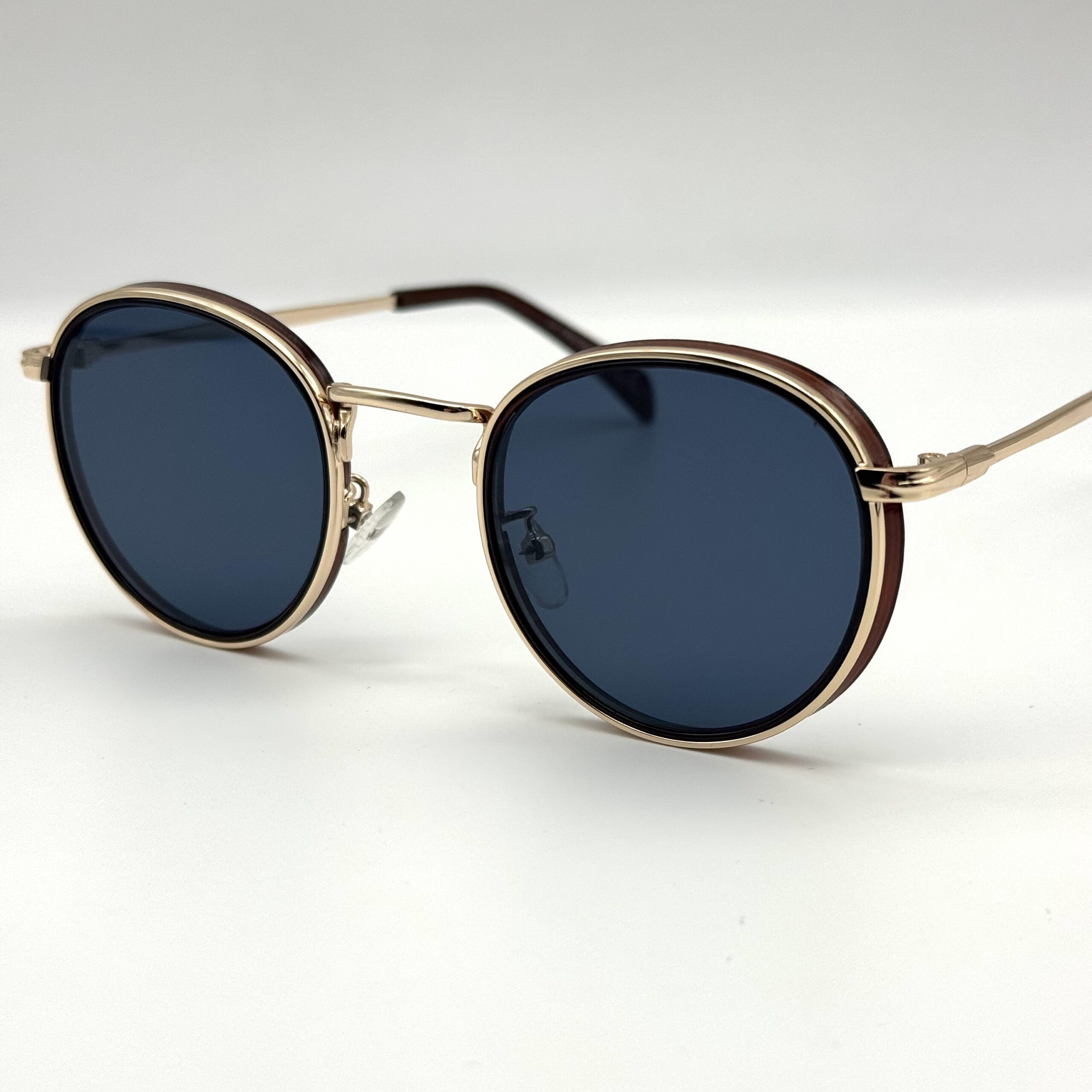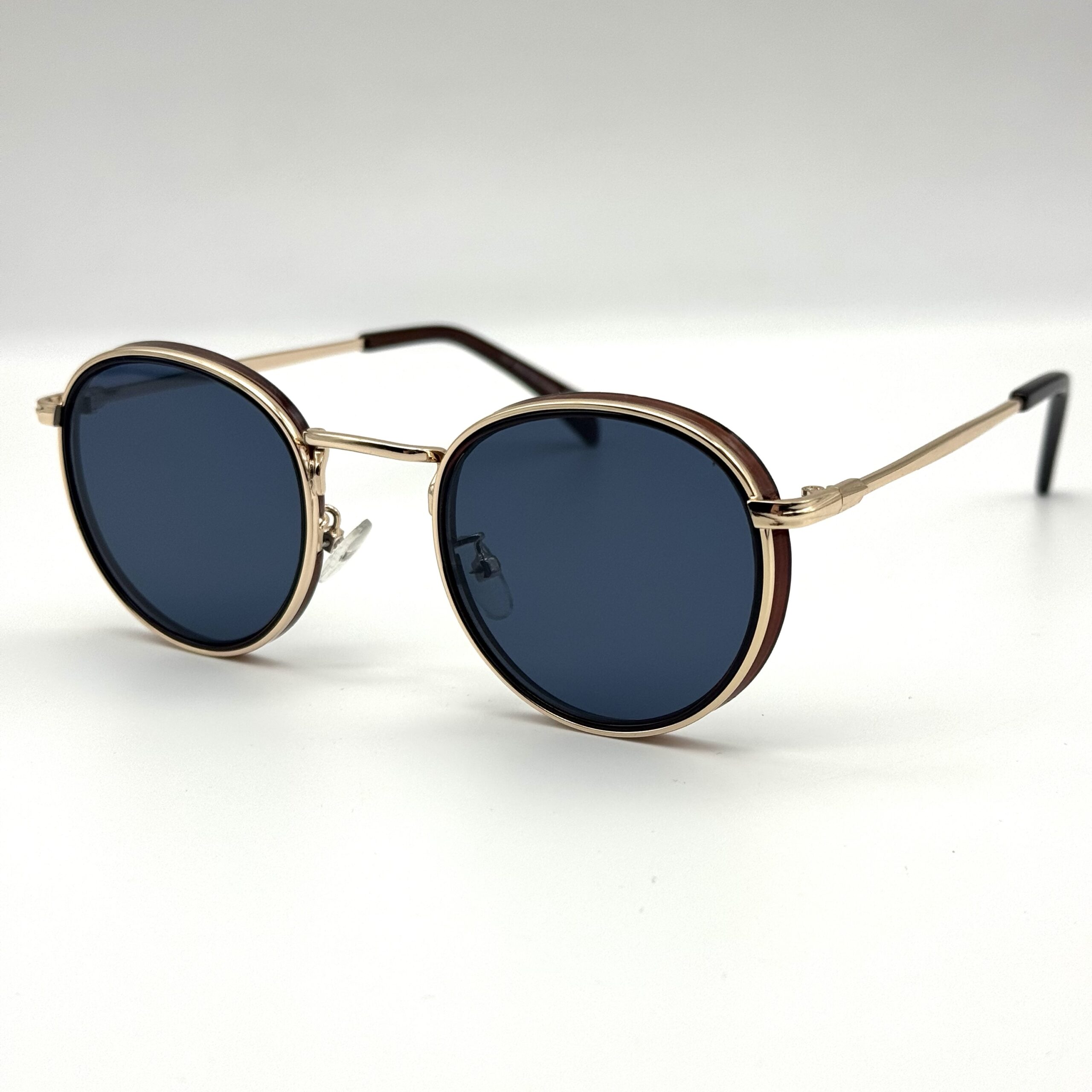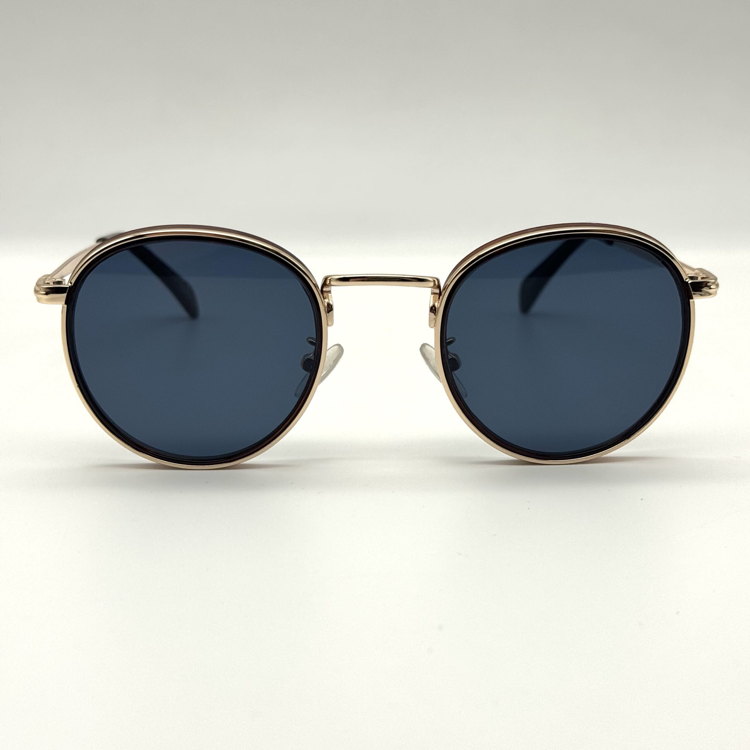 Un modèle rond chic avec double cerclage élégant. Monture dorée raffinée et verres bleu foncé pour un look premium, rétro et sophistiqué.
