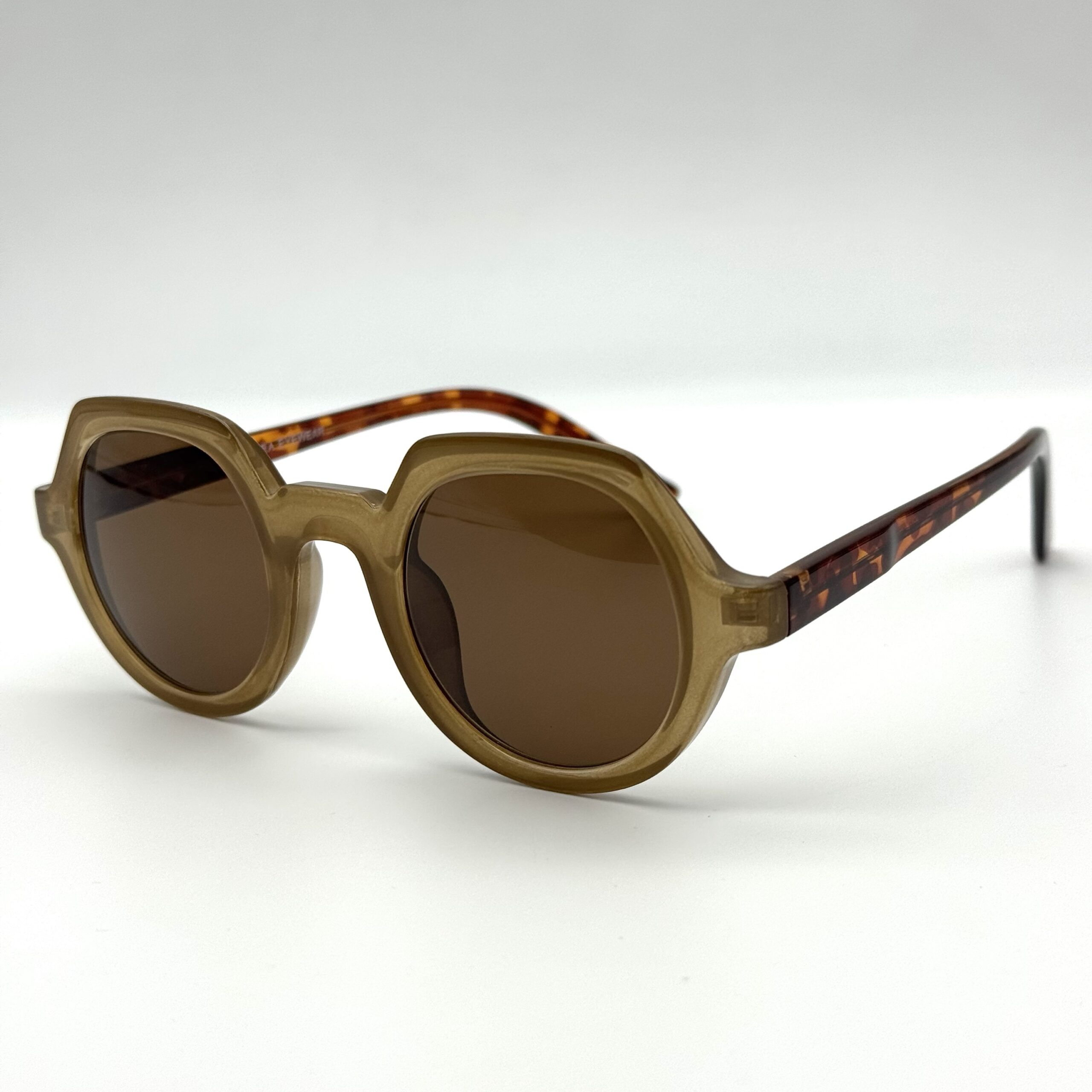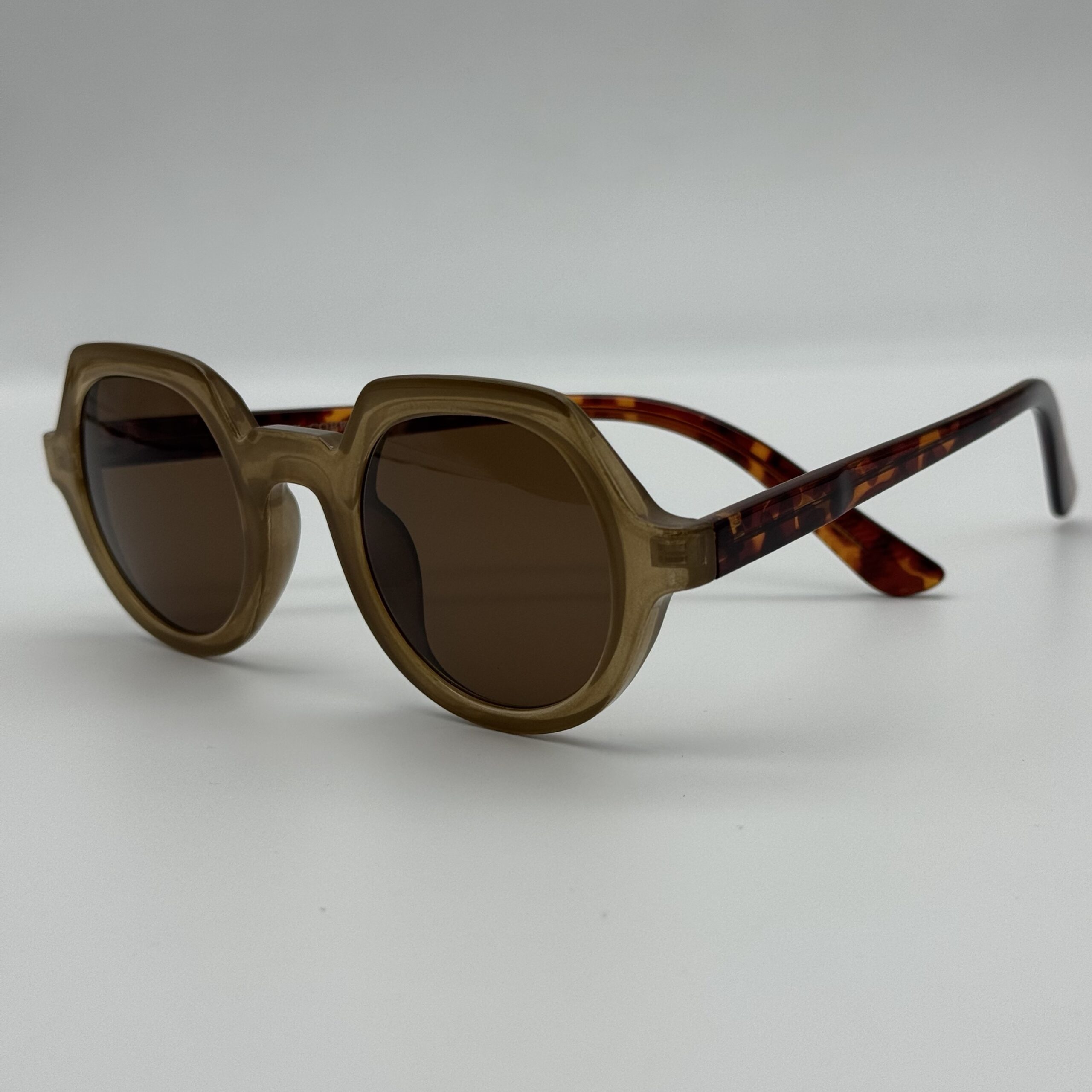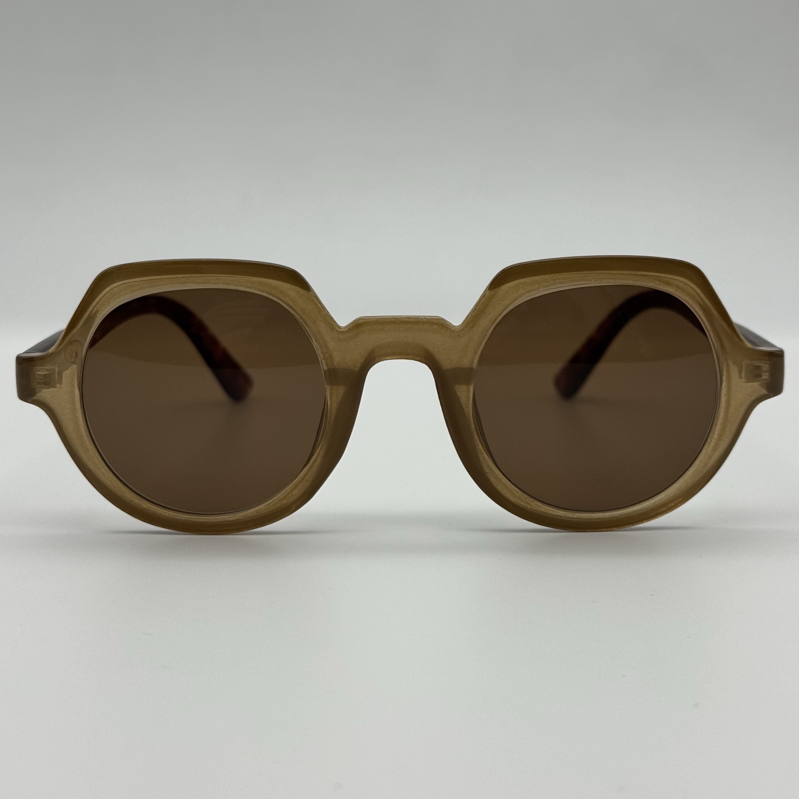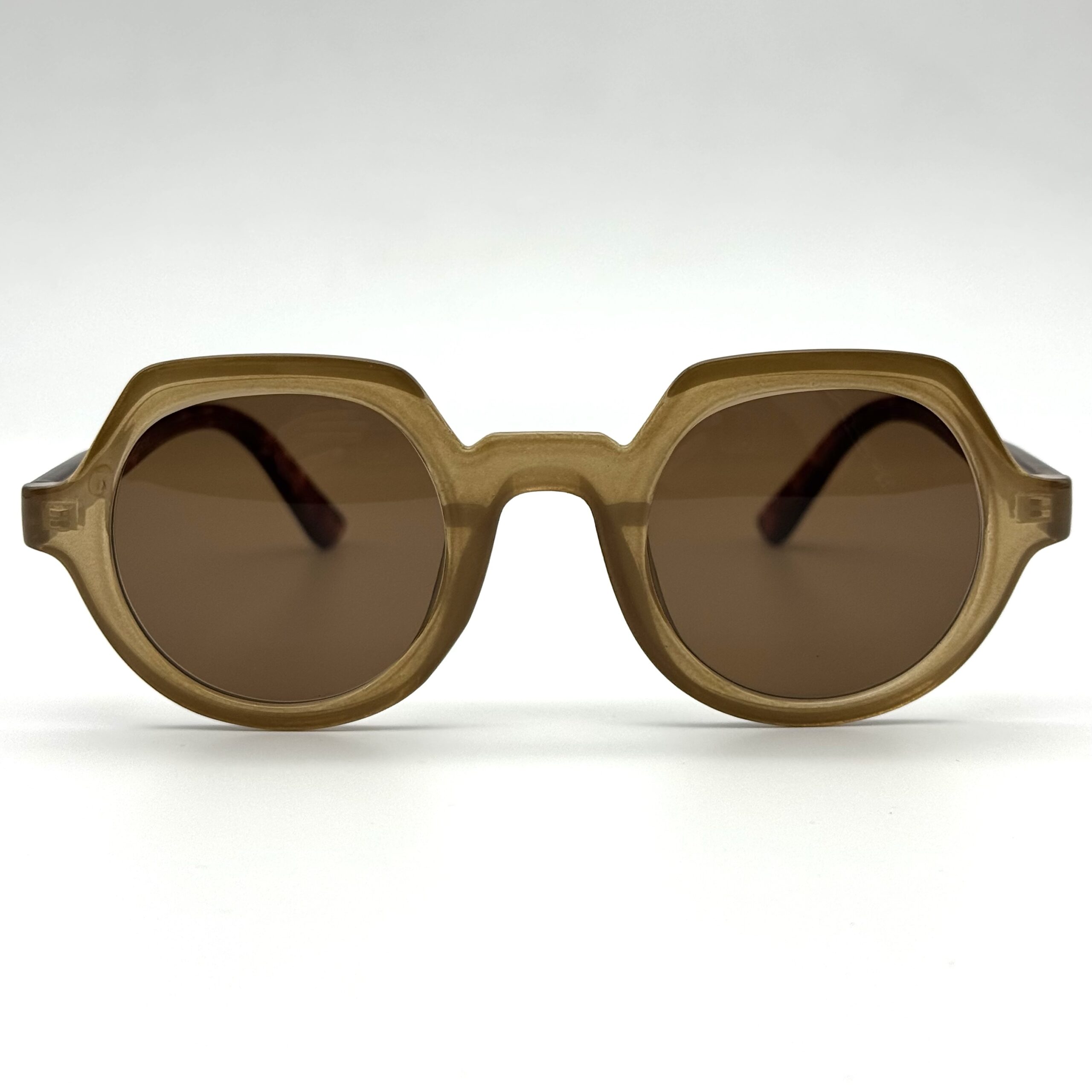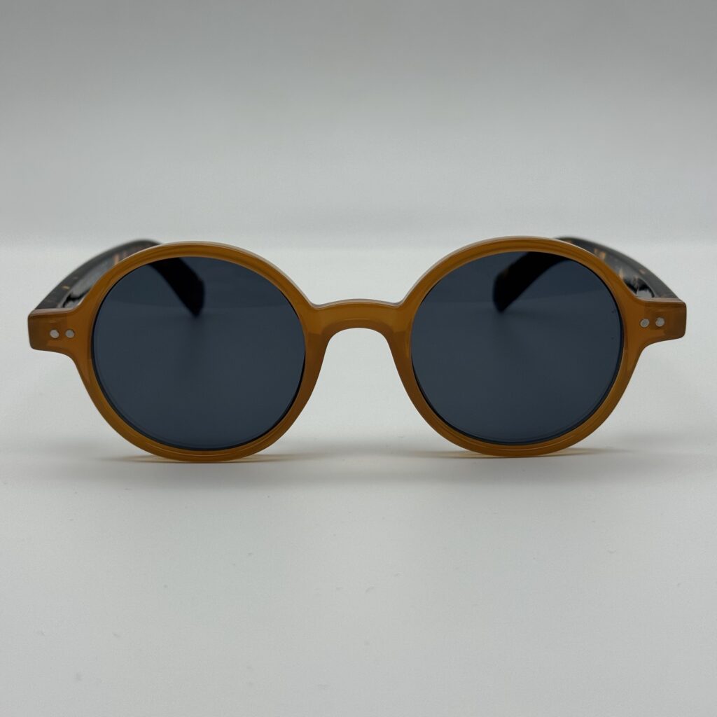 Un design original et audacieux : monture épaisse beige, forme ronde géométrique et branches effet écaille. Un modèle unique pour un style affirmé et tendance.
