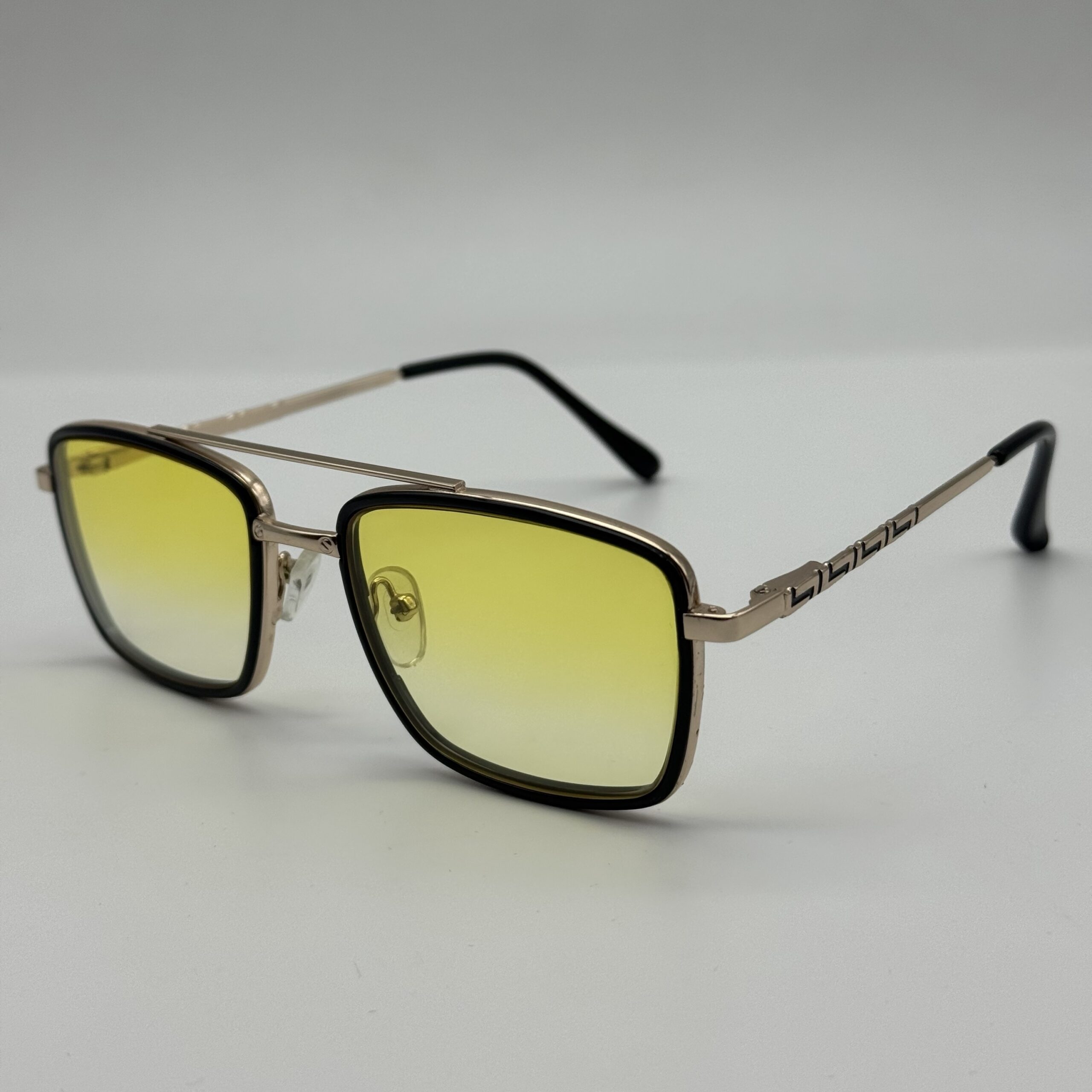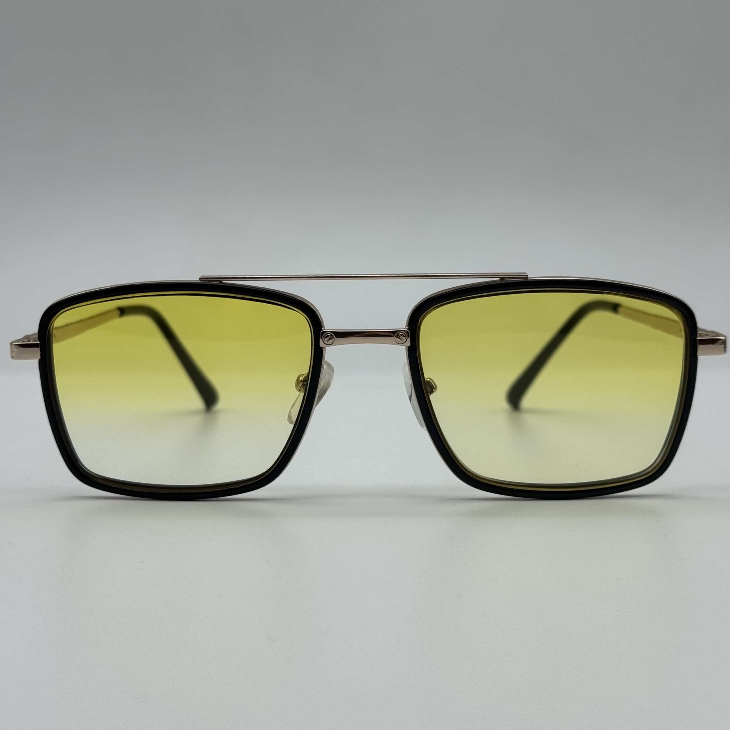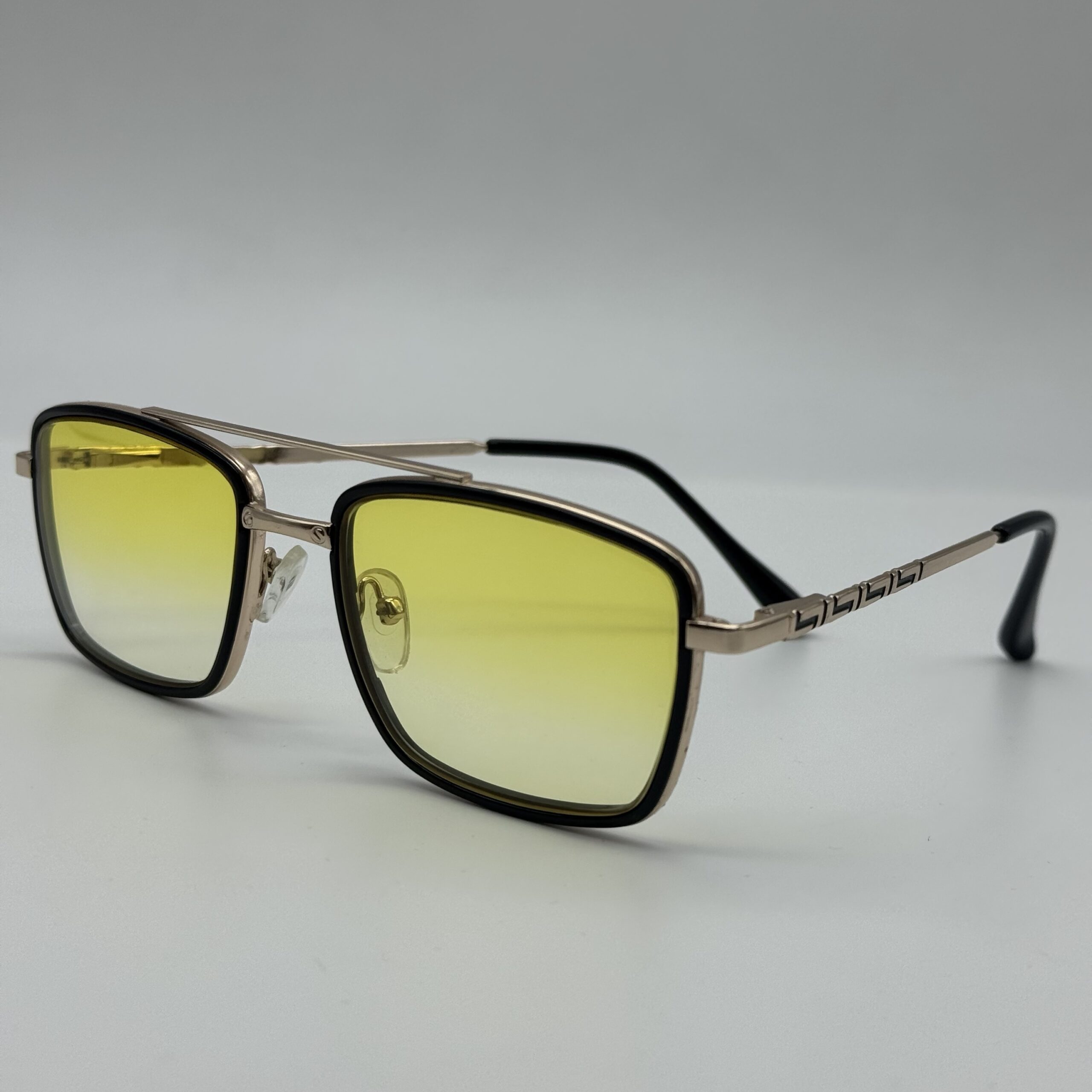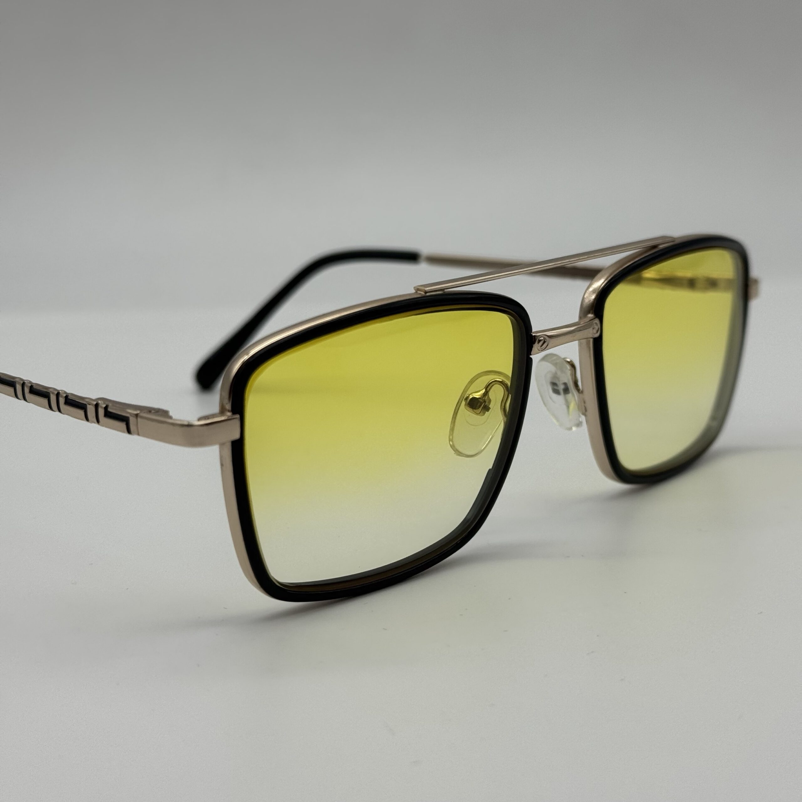 Un modèle rectangulaire moderne aux verres dégradés jaune lumineux. Le mélange métal doré + contour noir donne un style chic, affirmé et parfait pour un look solaire élégant.